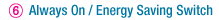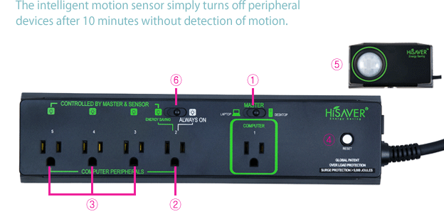 User selectable switch: Always On, for peripheral devices that require constant power. Energy Saving, outlet is controlled by the Motion Sensor similar to outlets 3-5.